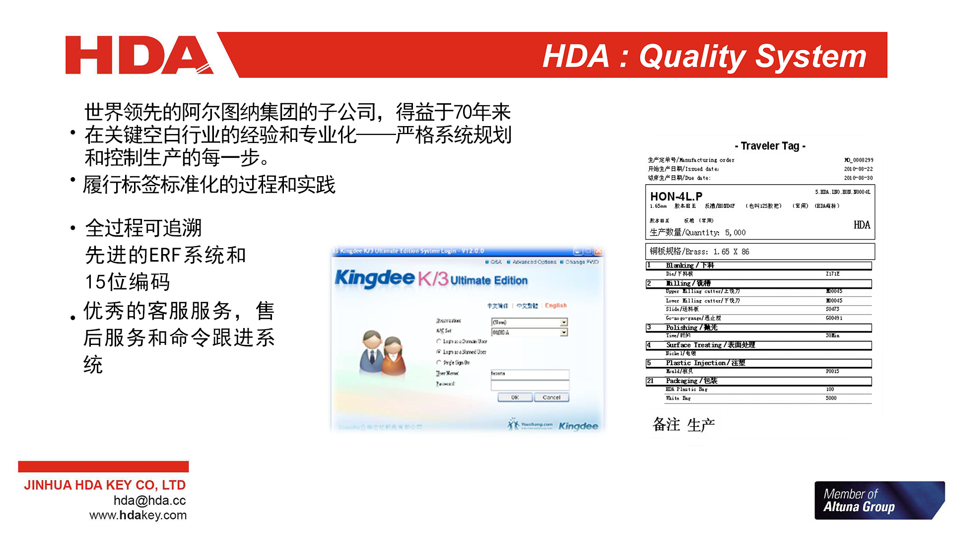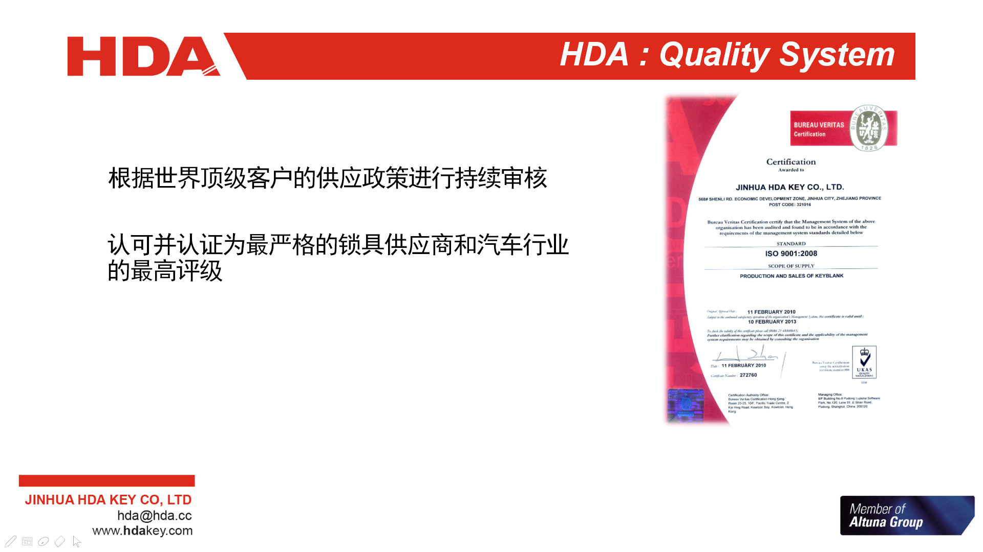 金華宏達鑰匙有限公司(簡稱HDA)位于浙江省金華市經(jīng)濟開發(fā)區(qū)。工廠距離上海2小時高鐵車程,毗鄰的義烏小商品城。自90年代初建立以來,HDA已擁有二十多年生產(chǎn)和開發(fā)鑰匙的經(jīng)驗。HDA是一家擁有上萬種原版產(chǎn)品的專業(yè)廠家,年產(chǎn)能約兩億條...